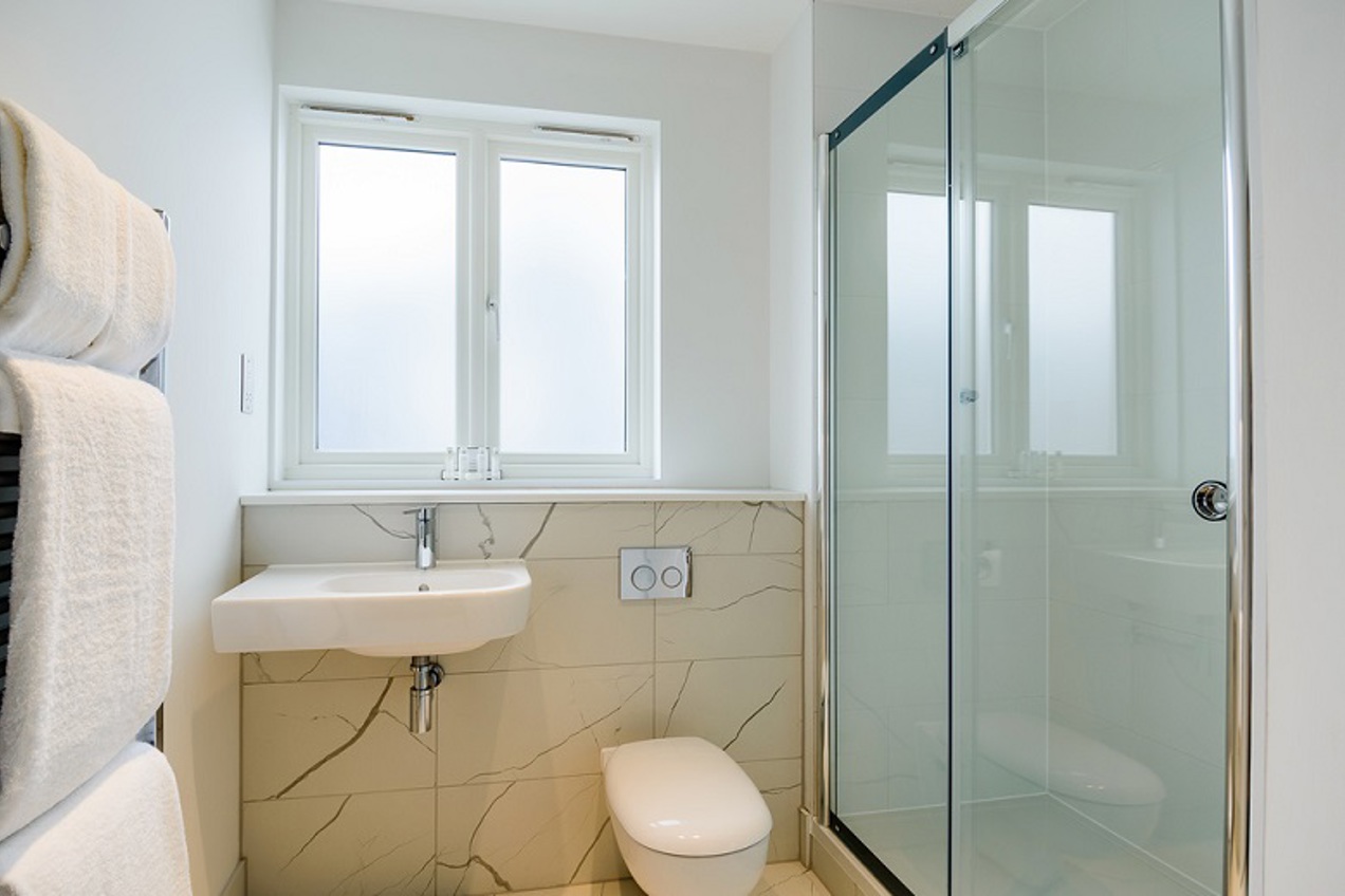 Split across two floors, the premium one bedroom apartment features a living room and a kitchen downstairs while the bedroom and the shower room are located upstairs.