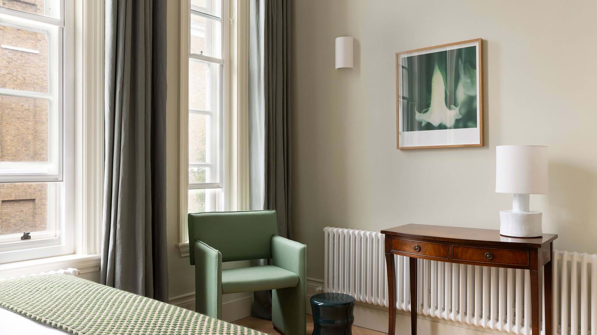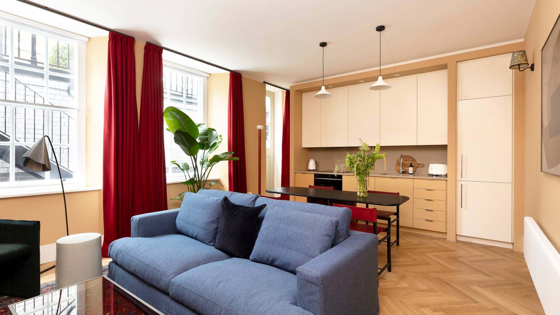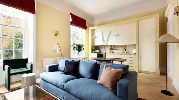 Harley Street Apartments offer a remarkable selection of 10 luxury serviced apartments nestled within a historic Grade II Listed building, masterfully designed by Claude Ferrier and beautifully restored by Barbara Weiss Architects. Each one- and two-bedroom apartment showcases a harmonious blend of diverse aesthetics, periods, and colors, creating stylish, comfortable, and inviting living spaces. With antique Persian rugs, tweed-covered sofas, and contemporary elements thoughtfully designed by Waldo Works, these interiors evoke a sense of elegant relaxation.