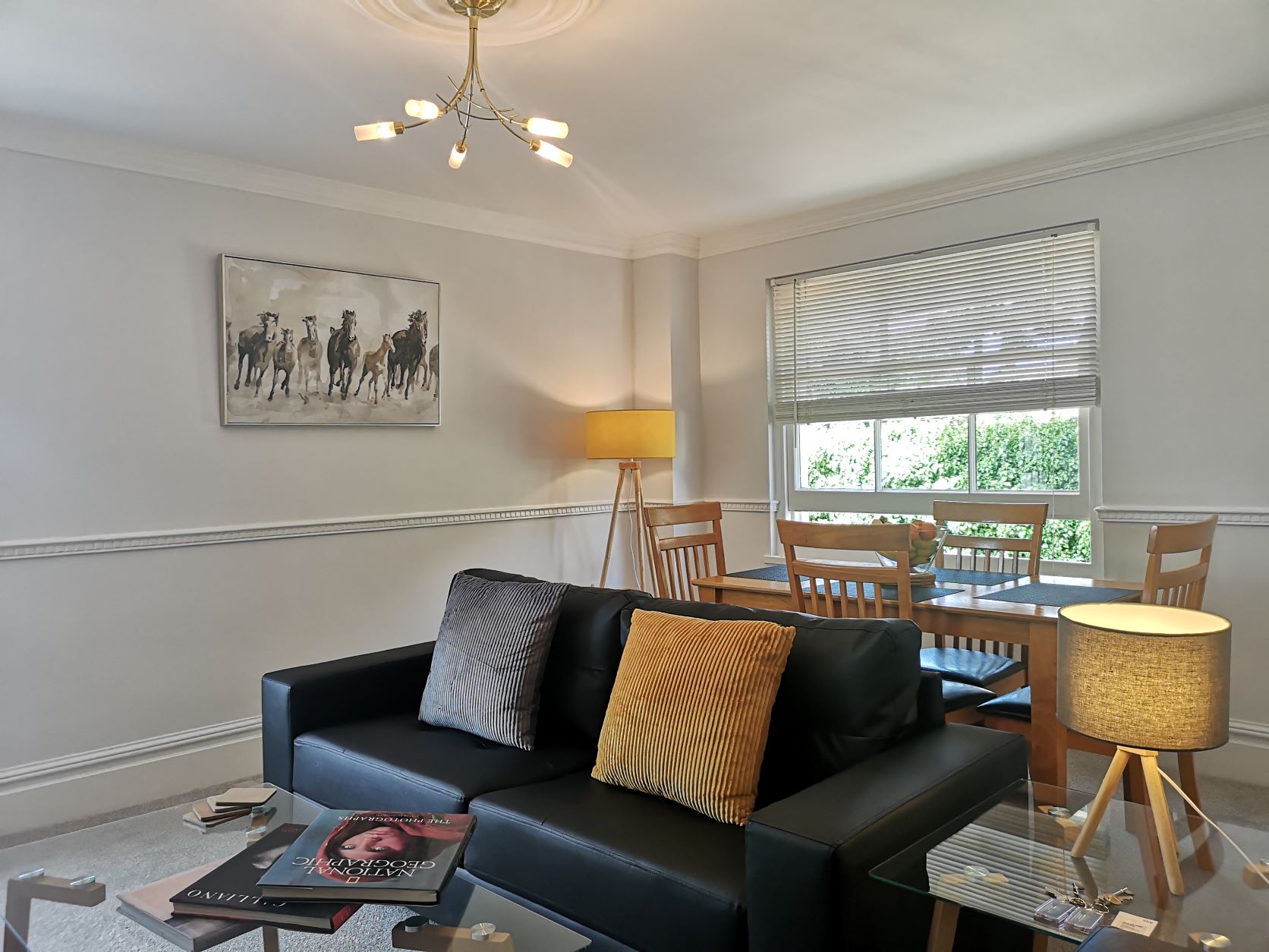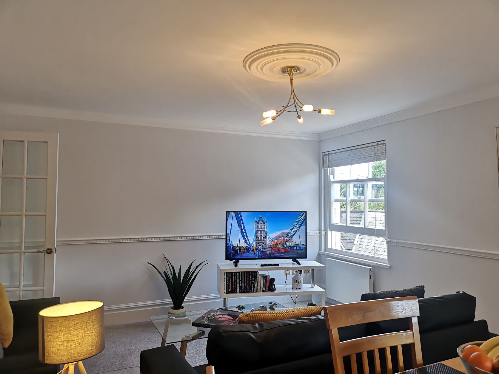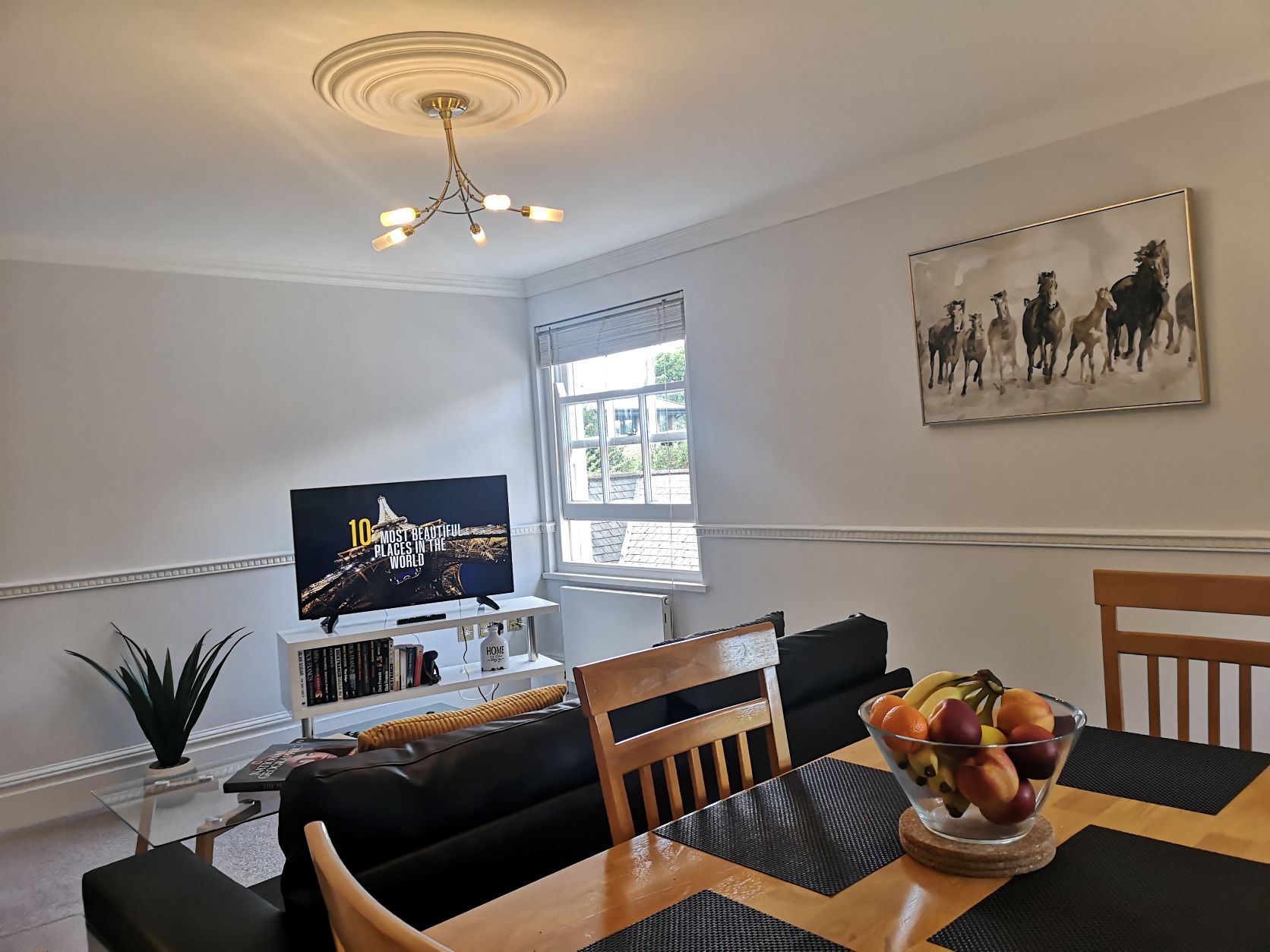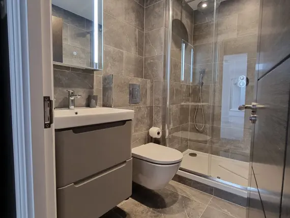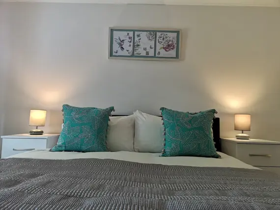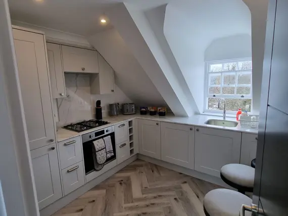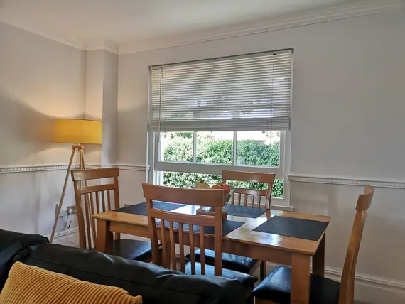 The kitchen is equipped with a full-sized fridge freezer and a dishwasher. In the living area, you’ll find a dining table with four chairs, a cozy two-seater and three-seater sofa, a coffee table, and a 43” smart TV. The main bathroom is spacious and features a shower over the bath.