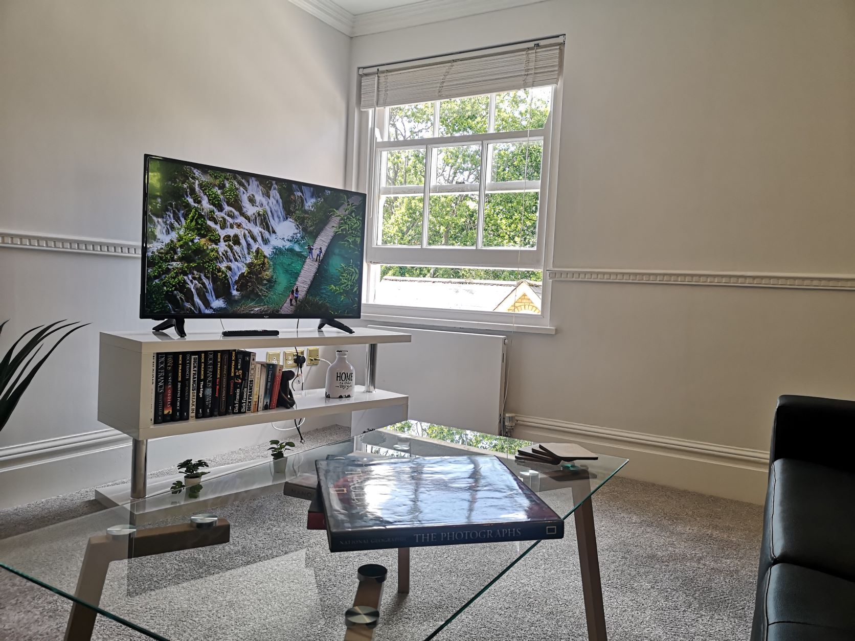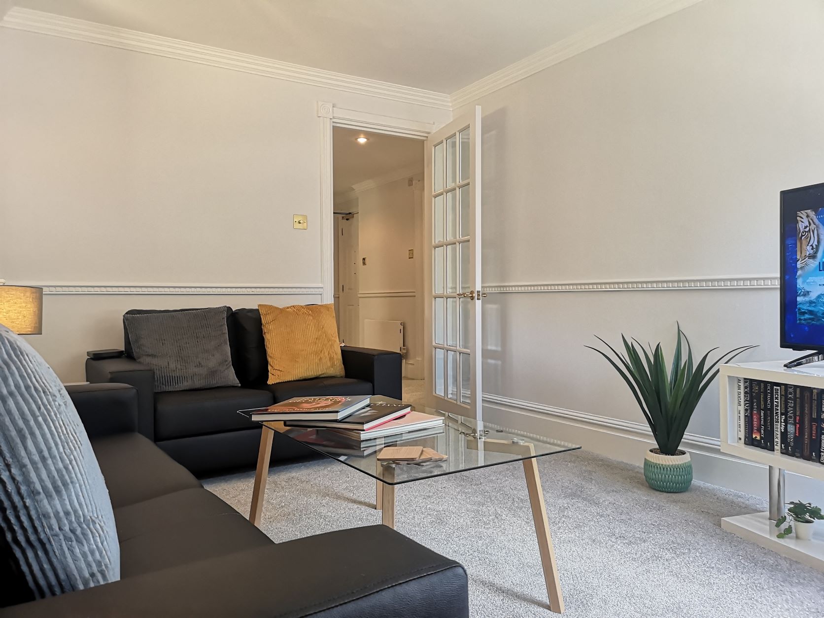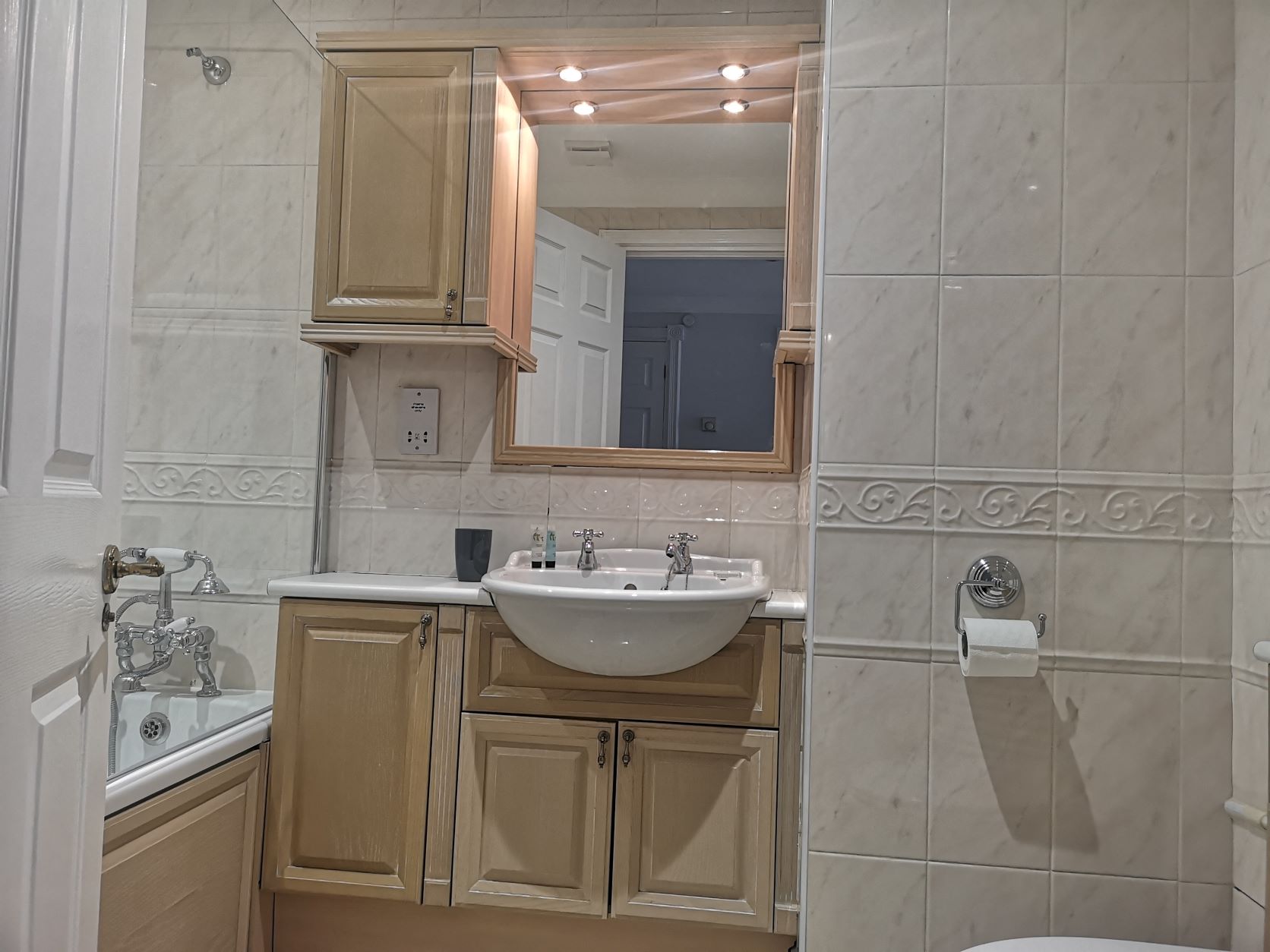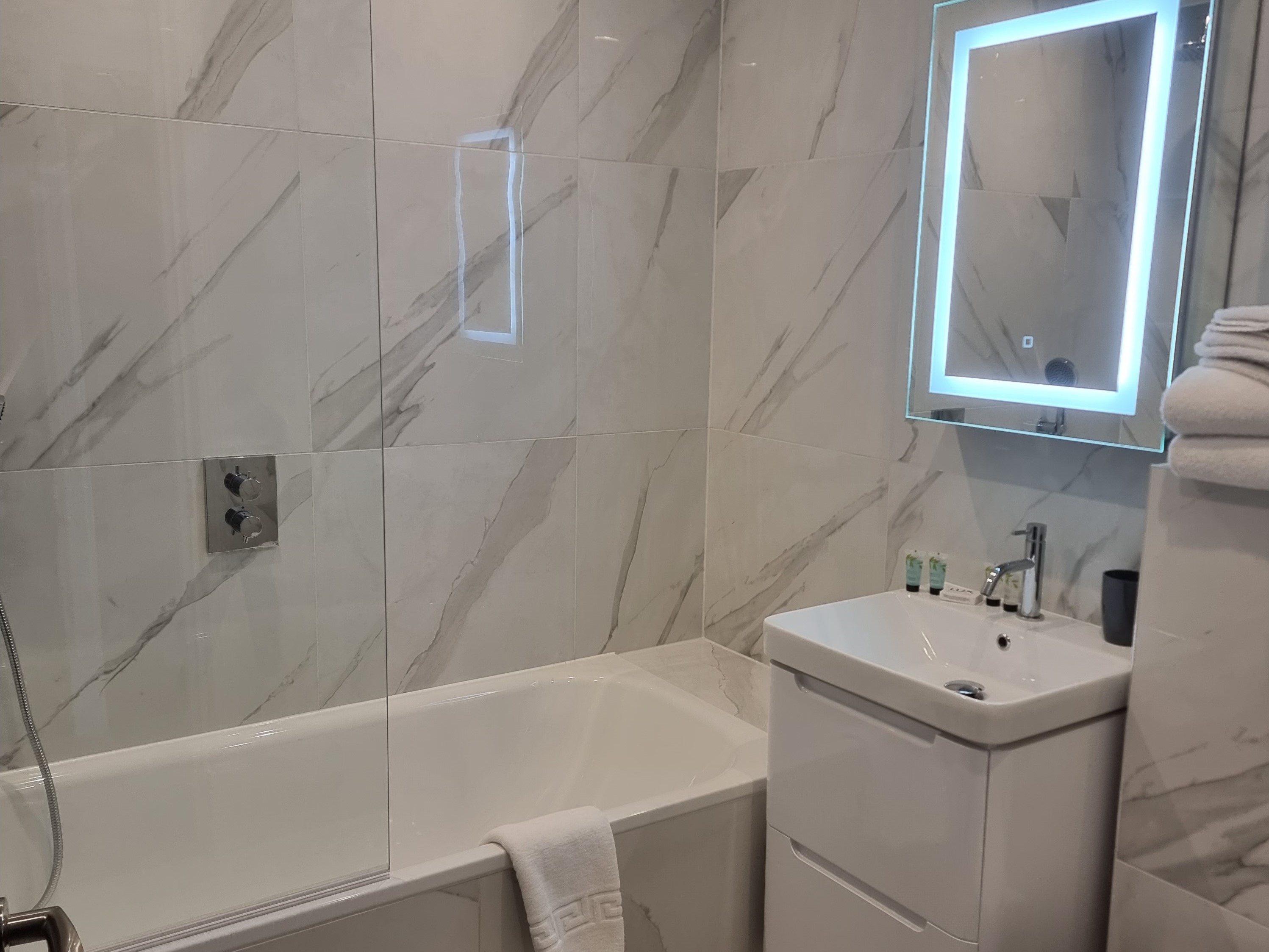 The kitchen is equipped with a full-sized fridge freezer and a dishwasher. In the living area, you’ll find a dining table with four chairs, a cozy two-seater and three-seater sofa, a coffee table, and a 43” smart TV. The main bathroom is spacious and features a shower over the bath.